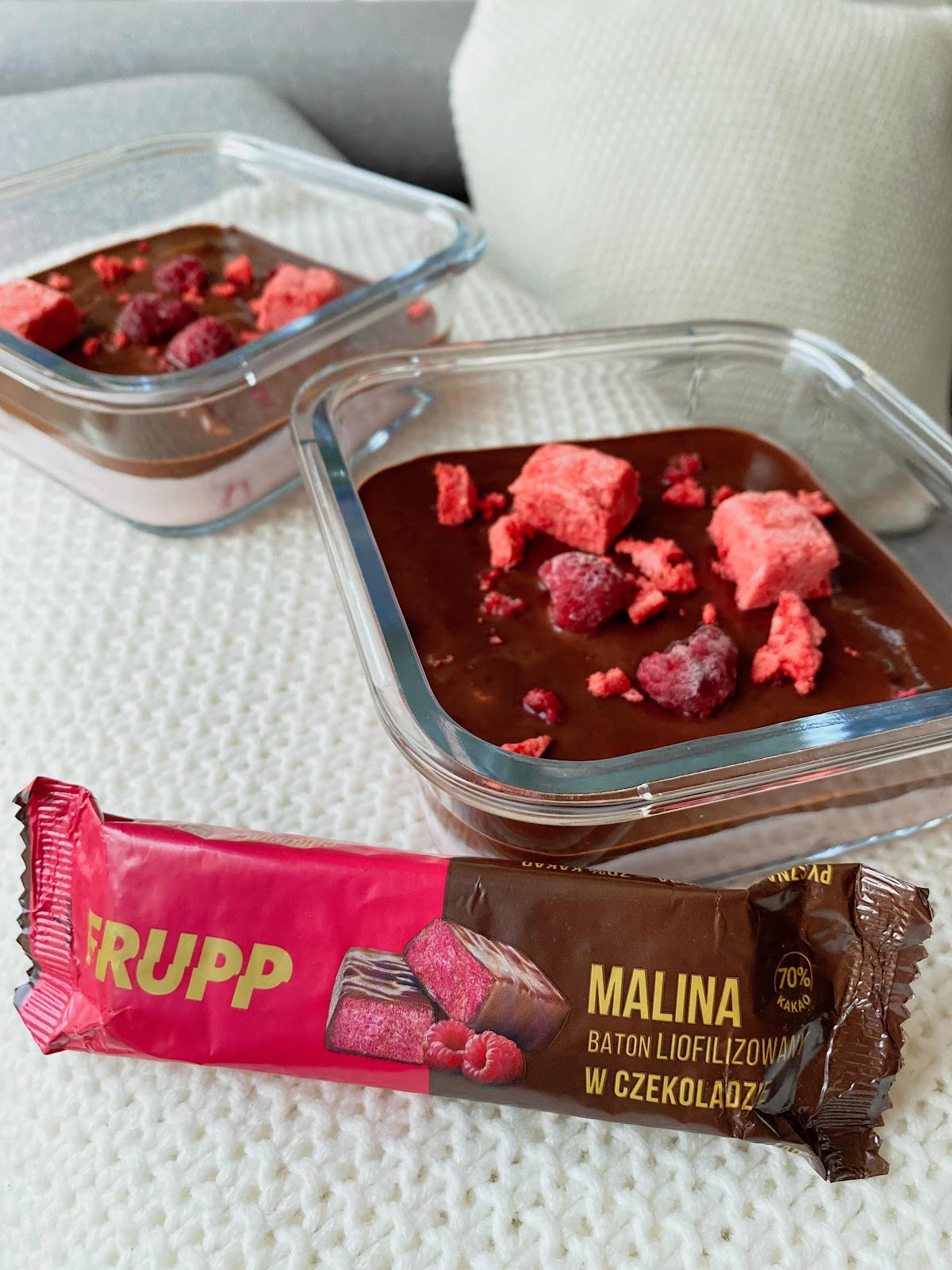 W kąpieli wodnej rozpuszczamy czekoladę z odrobiną napoju roślinnego / mleka. Chwile czekamy aż przestygnie po czym polewamy wierzch masy jogurtowej. Dekorujemy kawałkami batonika FRUPP i mrożonymi malinami.