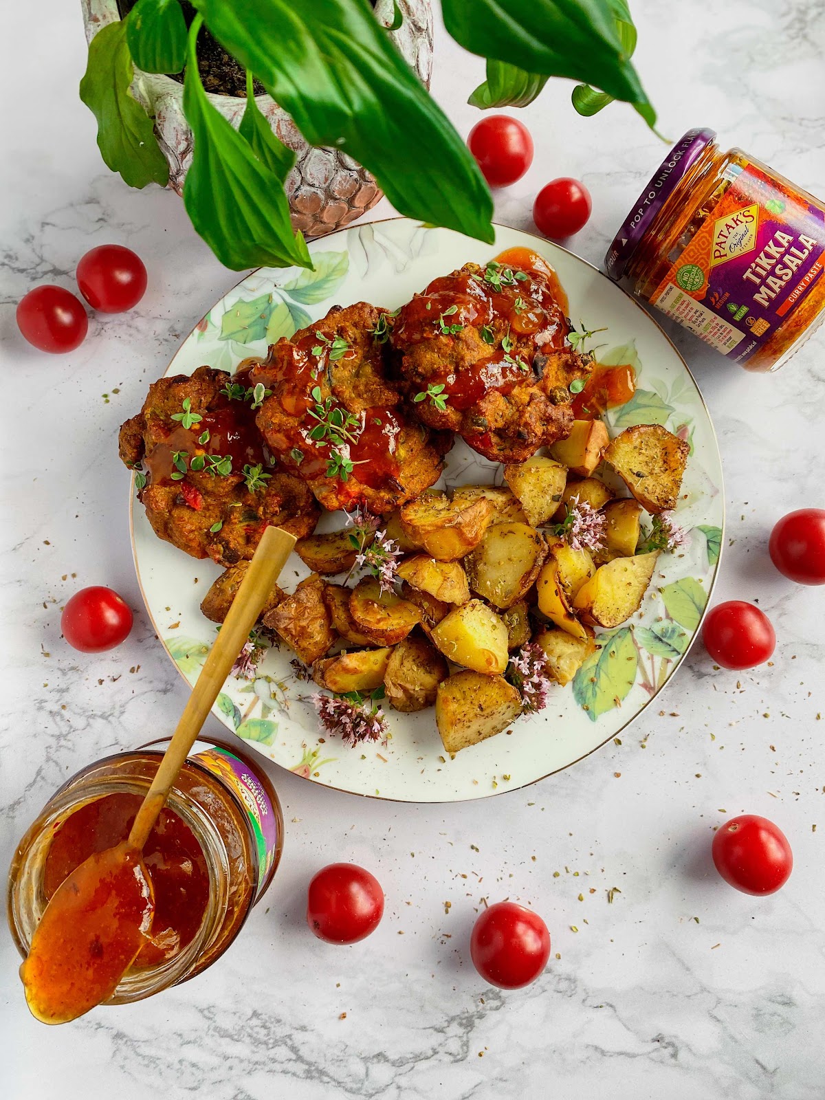 Pyszne, aromatyczne tofu kotleciki z warzywami z pastą TIKKA MASALA @pataks_polska , podane z pieczonymi ziemniakami z oregano oraz mango chutneyem @pataks_polska 💚